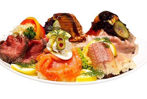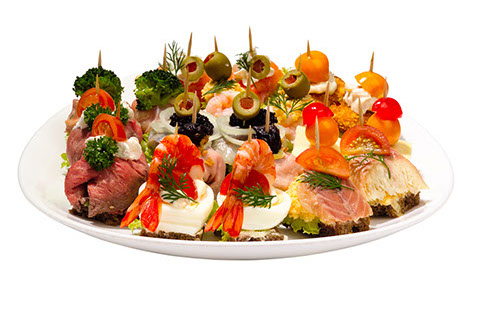 Smørrebrød, Canapes, Häppchen, warme Menüs, Kuchenbuffet