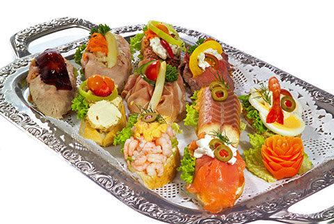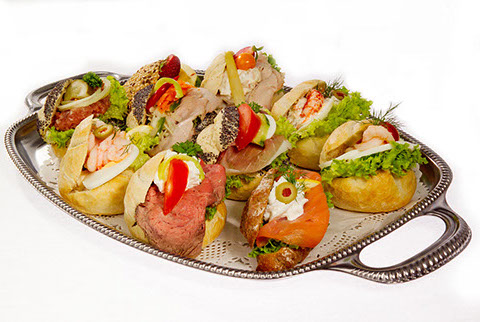 Smørrebrød, Canapes, Häppchen, warme Menüs, Kuchenbuffet